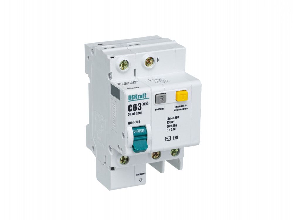Автоматический выключатель дифференциального тока серии ДИФ-101 Dekraft; 1P+N; ном.ток 63 А; характеристика C; откл.способность Icn = 4,5 kA; ток утечки 30 мА; блок дифф.защиты – электронный; ширина – 3 мод. х 18 мм; монтаж – на DIN-рейку. АВДТ применяются в сетях напряжением до 220 В пер.тока для защиты электроустановок от сверхтоков и токов утечки. Для расширения функционала АВДТ возможно использование аксессуаров от выключателей серии ВА-101.