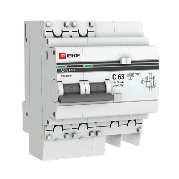 EKF PROxima АД-2 Диф. Автомат (C) 63А/30мА тип АС 4,5кА , электронный, арт DA2-63-30-pro