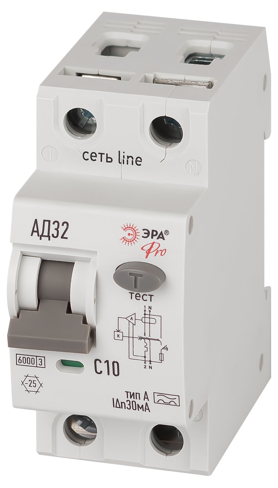 Автоматический выключатель дифференциального тока 6кА ЭРА АД-32 линейки Pro. АВДТ электронного типа. Профессиональные АВДТ ЭРА защищают человека от поражения электрическим током при повреждении изоляции электроустановок, предотвращают пожары вследствие токов утечки, предохраняют от перегрузки и короткого замыкания. Рекомендуются для защиты групповых линий, питающих розетки наружной установки, розеток и освещения подвалов и гаражей. Современное решение для квартирных щитков и промышленного применения.