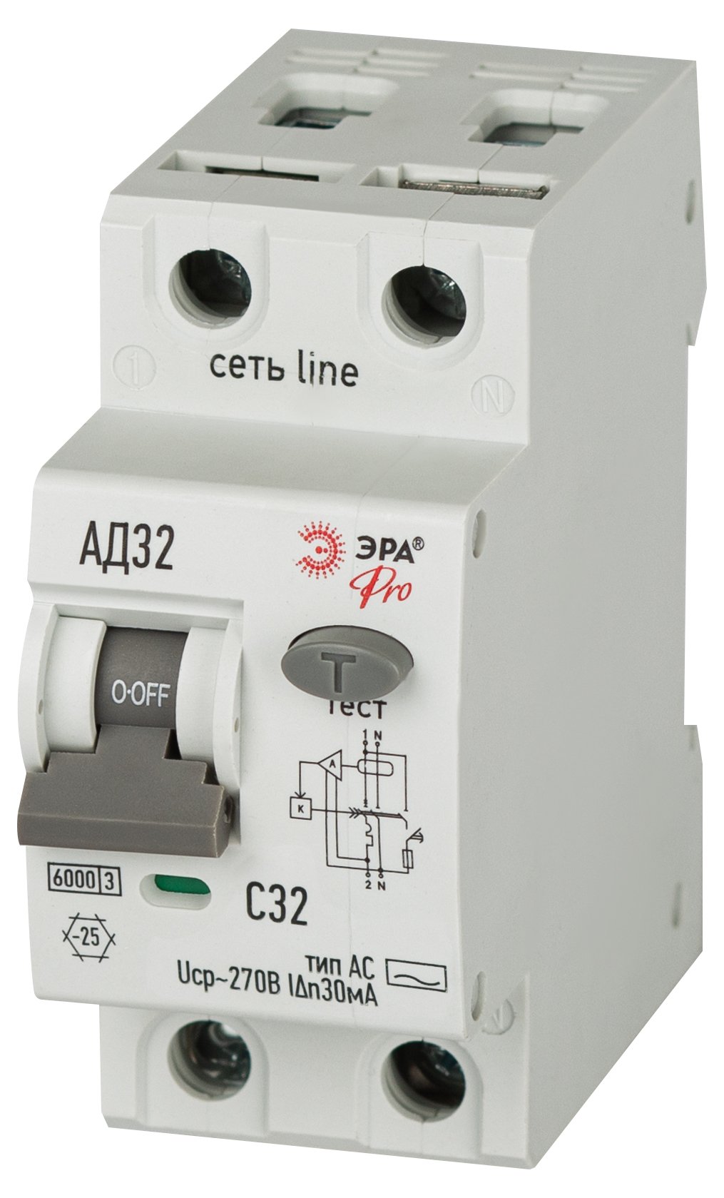 Автоматический выключатель дифференциального тока 6кА ЭРА АД-32 линейки Pro. АВДТ электронного типа. Профессиональные АВДТ ЭРА защищают человека от поражения электрическим током при повреждении изоляции электроустановок, предотвращают пожары вследствие токов утечки, предохраняют от перегрузки и короткого замыкания. Рекомендуются для защиты групповых линий, питающих розетки наружной установки, розеток и освещения подвалов и гаражей. Современное решение для квартирных щитков и промышленного применения.