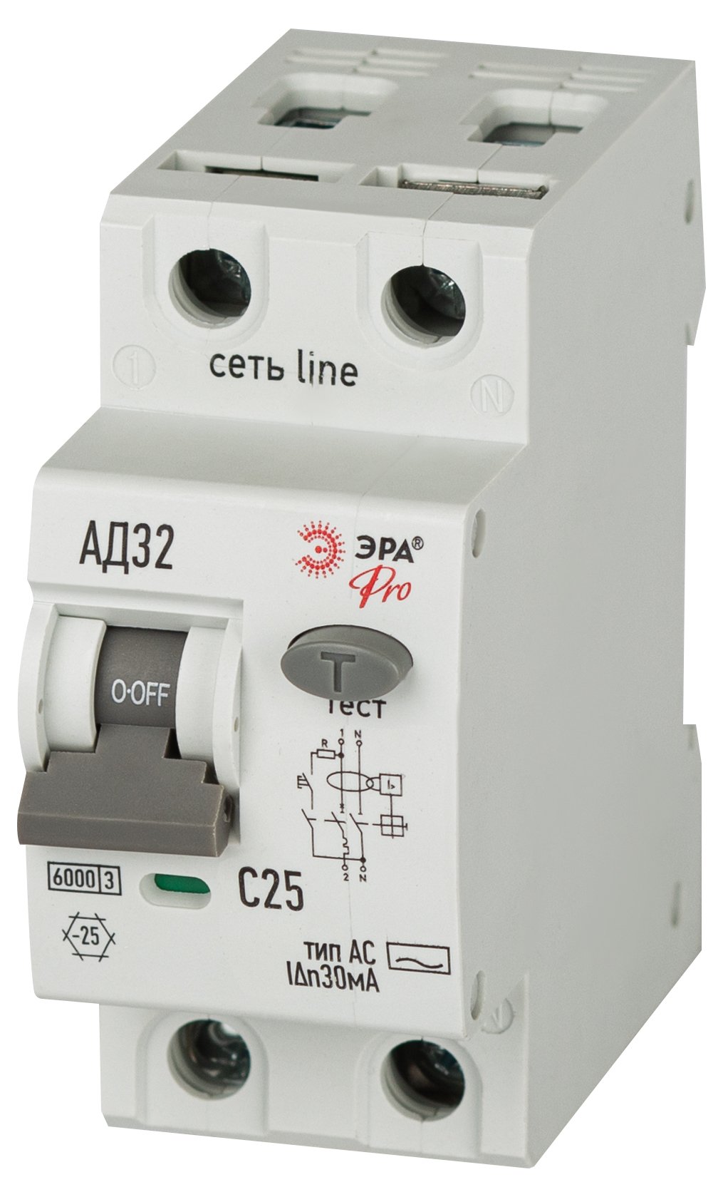 Автоматический выключатель дифференциального тока 6кА ЭРА АД-32 линейки Pro. АВДТ электромеханического типа. Профессиональные АВДТ ЭРА защищают человека от поражения электрическим током при повреждении изоляции электроустановок, предотвращают пожары вследствие токов утечки, предохраняют от перегрузки и короткого замыкания. Рекомендуются для защиты групповых линий, питающих розетки наружной установки, розеток и освещения подвалов и гаражей. Современное решение для квартирных щитков и промышленного применения.