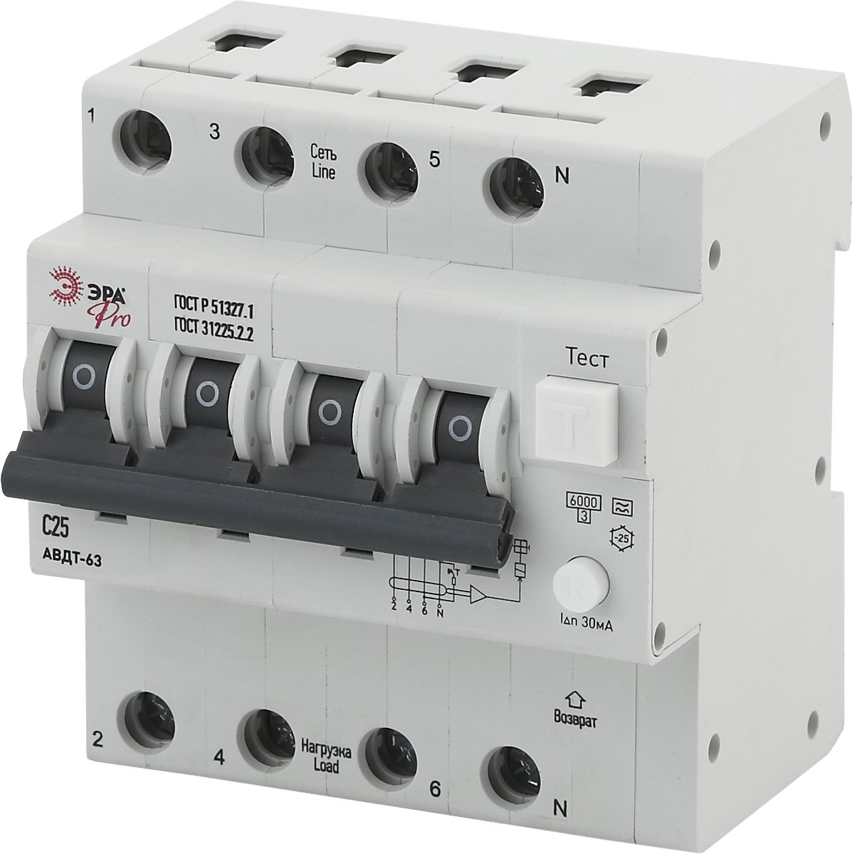—ЭРА NO-901-94 Pro Автоматический выключатель дифференциального тока АВДТ 63 3P+N C25 30мА тип A, арт Б0031844