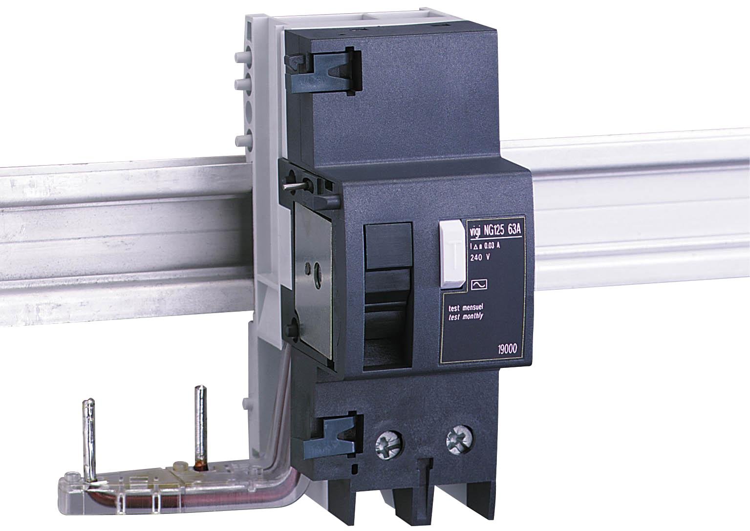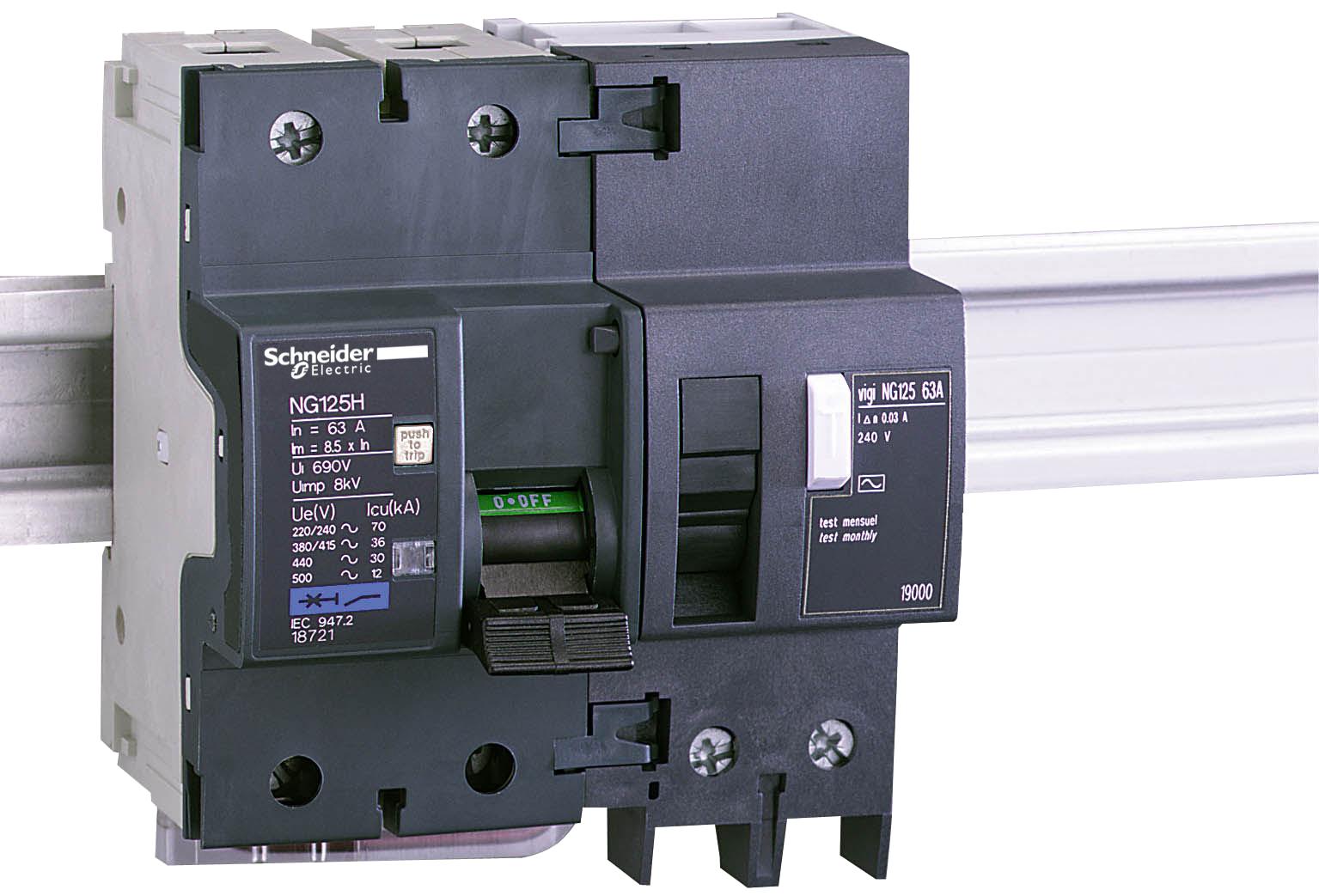 БЛОК ДИФФ. ЗАЩИТЫ VIGI NG125 2П 63A 30МА AC. В сочетании с автоматическим выключателем блок Vigi NG125 выполняет функции: защита людей от поражения электротоком при прямом прикосновении (30 мА); защита людей от поражения электротоком при косвенном прикосновении (u 300 мА); защита электроустановок от риска возгорания (300 мА или 500 мА).