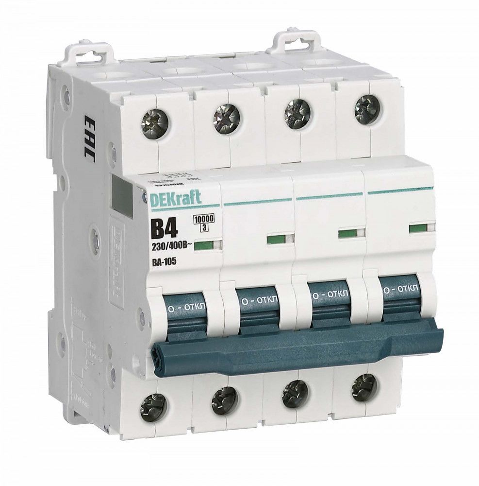Автоматический выключатель серии ВА-105 Dekraft; 4P; ном. ток 4 А; характеристика В; откл. способность 10 кА; ширина модуля 18мм. Аппараты имеют механизм мгновенной коммутации, 6 монолитных заклепок, которые повышают прочность корпуса. Боковые каналы охлаждения повышают стабильность работы при высоких температурах окружающей среды. Есть возможность установки дополнительных аксессуаров с левой стороны устройства. Аппарат на 100% совместим с корпусами и оболочками Dekraft и Systeme Electric.