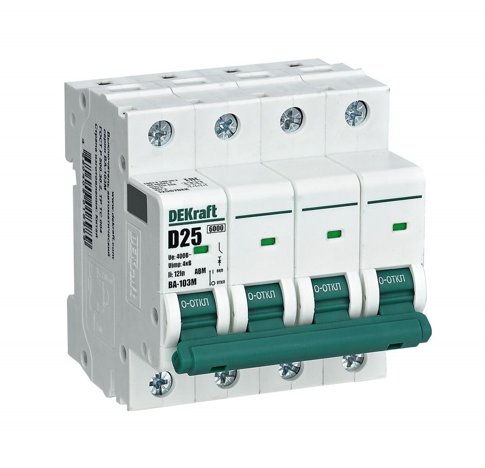 Автоматический выключатель без теплозащиты серии ВА-103M Dekraft; 4P; ном. ток 50 А; ном. раб. напряжение 400 В; кривая отключения C. Автоматические выключатели серии ВА-103М имеют специальное назначение для систем противопожарной защиты и вентиляции и выдерживают ток КЗ до 6000 А. Также они могут использоваться для нечастых оперативных включений и отключений указанных цепей. Автоматические выключатели соответствуют директиве RoHS, имеют расширенный диапазон рабочих температур от -25 до +60 °C, удобны и безопасны в эксплуатации.