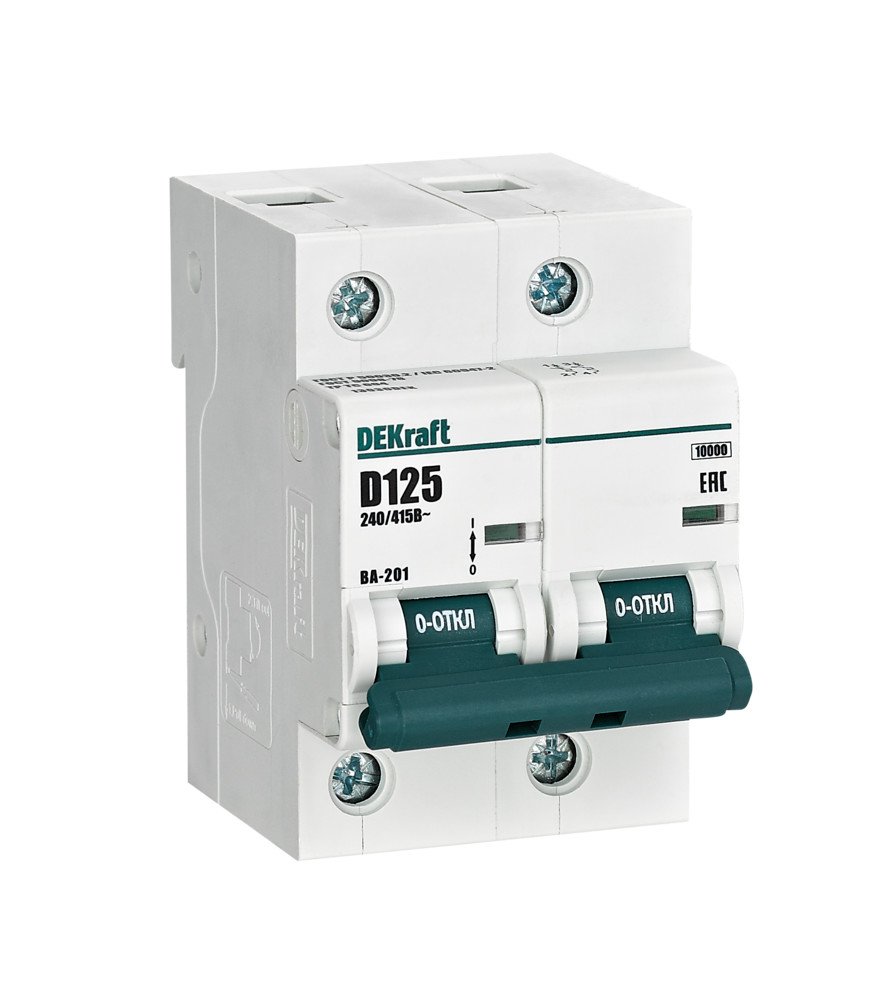 Автоматический выключатель серии ВА-201 Dekraft; 2P; номинальный ток 125 А; характеристика D; отключающая способность 10 кА; ширина модуля 27мм. Монолитная лицевая панель обеспечивает безопасную эксплуатацию аппарата. Окошко-индикатор всегда показывает состояние аппарата вне зависимости от положения рукоятки управления. Двухпозиционная защелка облегчает монтаж выключателя.