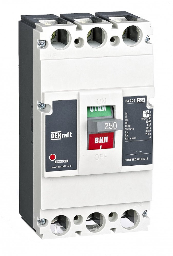 Автоматический выключатель в литом корпусе серии ВА-303L DEKraft; 3P; номинальный ток 315 А; откл. способность Icu = 35 kA (при 400 В пер.тока); уставка мгновенного срабатывания Ii = 5In. В комплект поставки входят 4 межфазные перегородки и крепеж на монтажной плате. Выключатели имеют компактный размер (на 10-15% меньше по сравнению с аналогами), что экономит место в распределительном щите. Уставка срабатывания 5хIn обеспечивает чувствительность к токам КЗ в конце линий большой длины.
