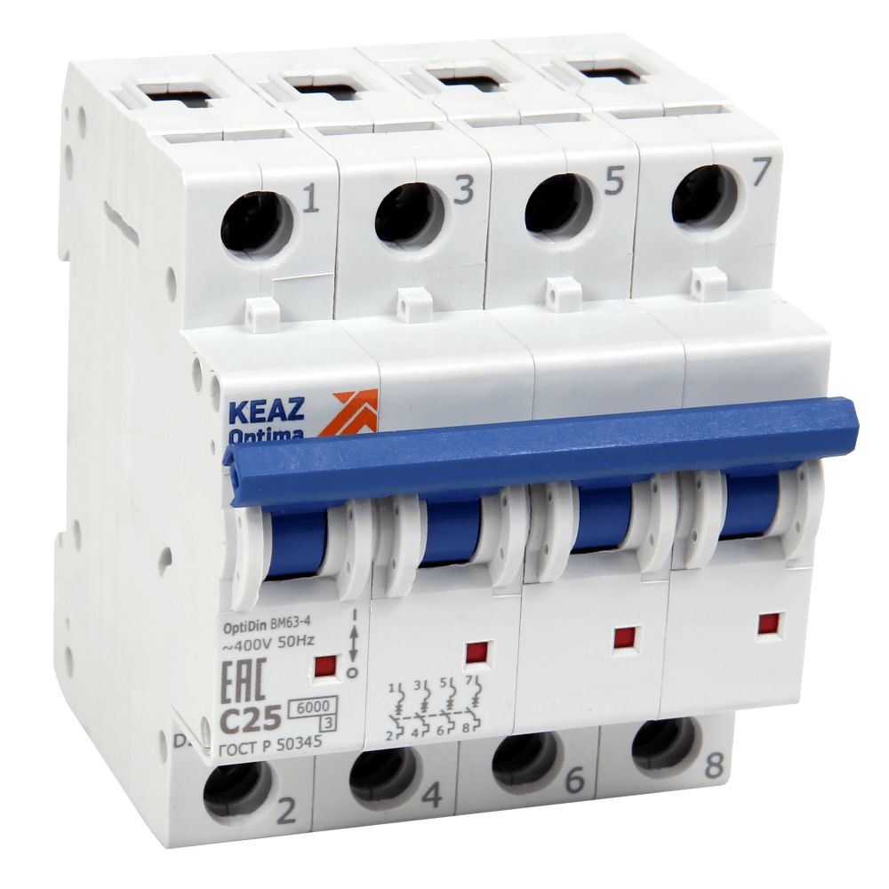 Модульный автоматический 4 полюсный выключатель переменного тока с предельной коммутационной способностью при переменном токе 6 кА на номинальный ток 2 А .