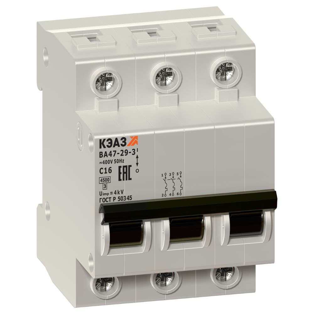 Модульный автоматический 3 полюсный выключатель переменного тока с предельной коммутационной способностью при переменном токе 4.5 кА на номинальный ток 6 А .