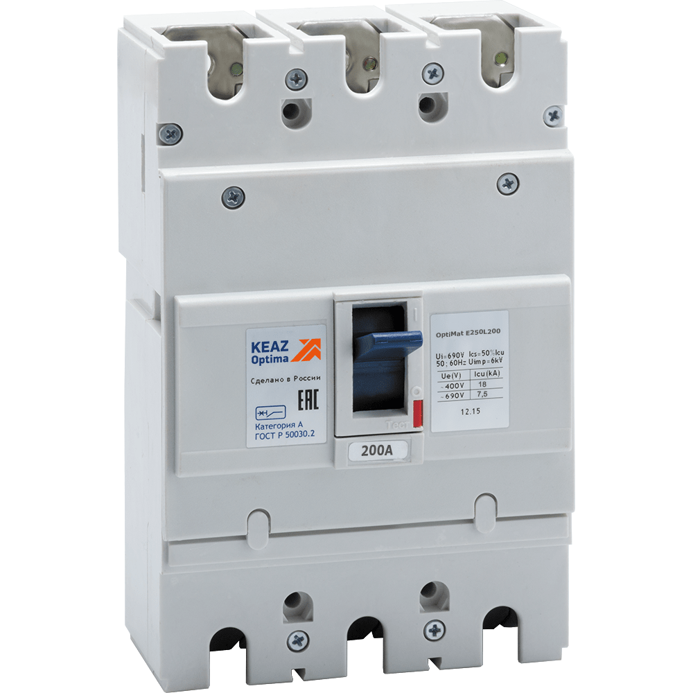 Блочный автоматический 3 полюсный выключатель переменного тока с предельной коммутационной способностью при переменном токе 18 кА на номинальный ток 200 А .