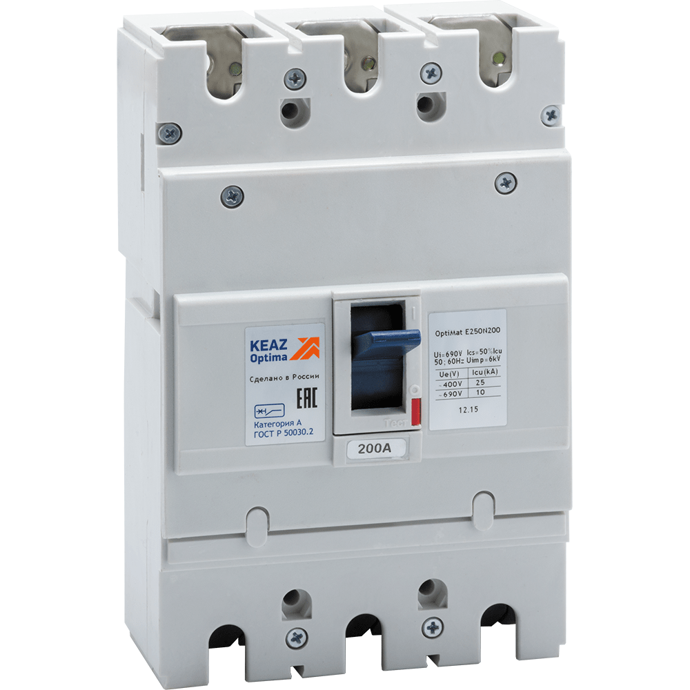 Блочный автоматический 3 полюсный выключатель переменного тока с предельной коммутационной способностью при переменном токе 25 кА на номинальный ток 200 А .