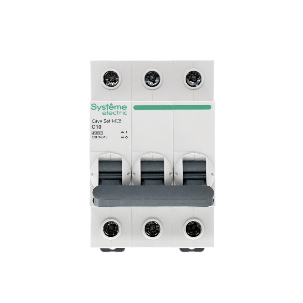 Автоматический выключатель серии City9 Set Systeme Electric, 3-полюсный, номинальный ток 10 А, характеристика С, Icn = 4.5 кА. Применяется в электрических сетях напряжением 400 В. Предназначен для защиты от перегрузок и токов короткого замыкания. Оснащен механизмом «мгновенной коммутации». Ударопрочный корпус из специального пластика с 6 металлическими заклепками. Безопасные клеммы исключают попадание кабелей в заклеммное пространство.