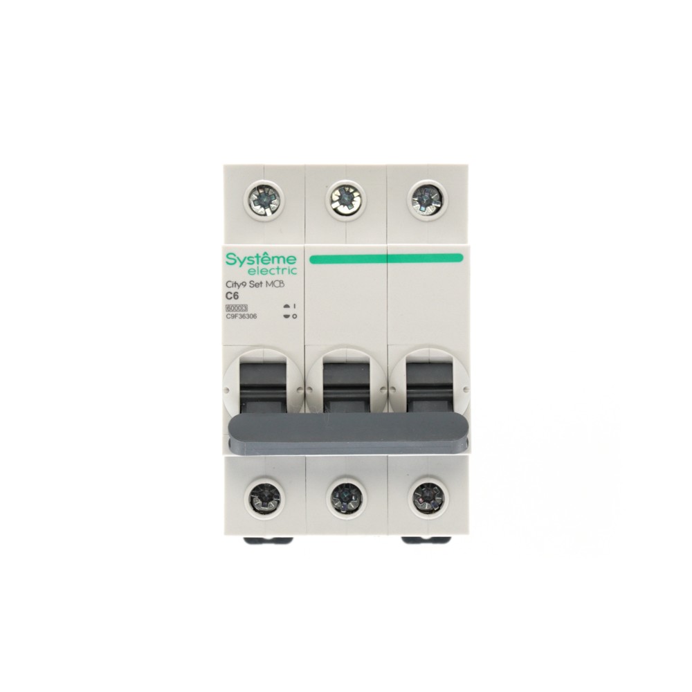Автоматический выключатель серии City9 Set Systeme Electric, 3-полюсный, номинальный ток 6 А, характеристика С, Icn = 6 кА. Применяется в электрических сетях напряжением 400 В. Предназначен для защиты от перегрузок и токов короткого замыкания. Оснащен механизмом «мгновенной коммутации». Ударопрочный корпус из специального пластика с 6 металлическими заклепками. Безопасные клеммы исключают попадание кабелей в заклеммное пространство.