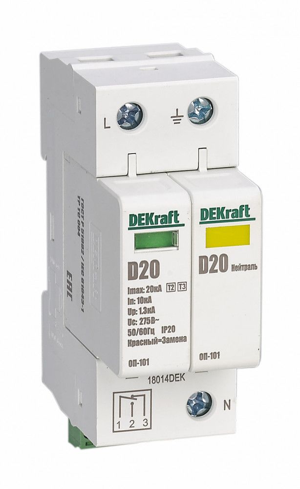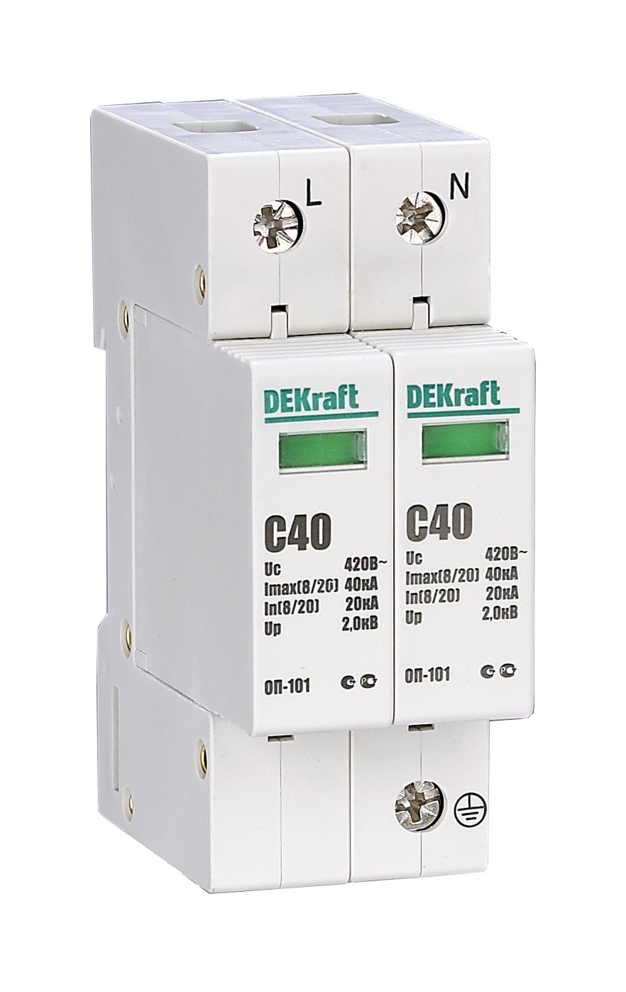 Ограничитель перенапряжения серии ОП-101 Dekraft ; 2P; макс.разрядный ток 40 кА; мак.рабочее напряжение 440 В; класс 2(C); монтаж – на DIN-рейку; ширина – 2 мод. х 18 мм. Ограничители срабатывают за миллиардную долю секунды и надежно защищают оборудование от бросков напряжения. Повышенный уровень защиты позволяет ограничить перенапряжения до 2 кВ. Ограничитель оснащён сигнальным контактом. Применяются во ВРУ, ГРЩ, распределительных щитках, коробках и непосредственно возле аппаратов.