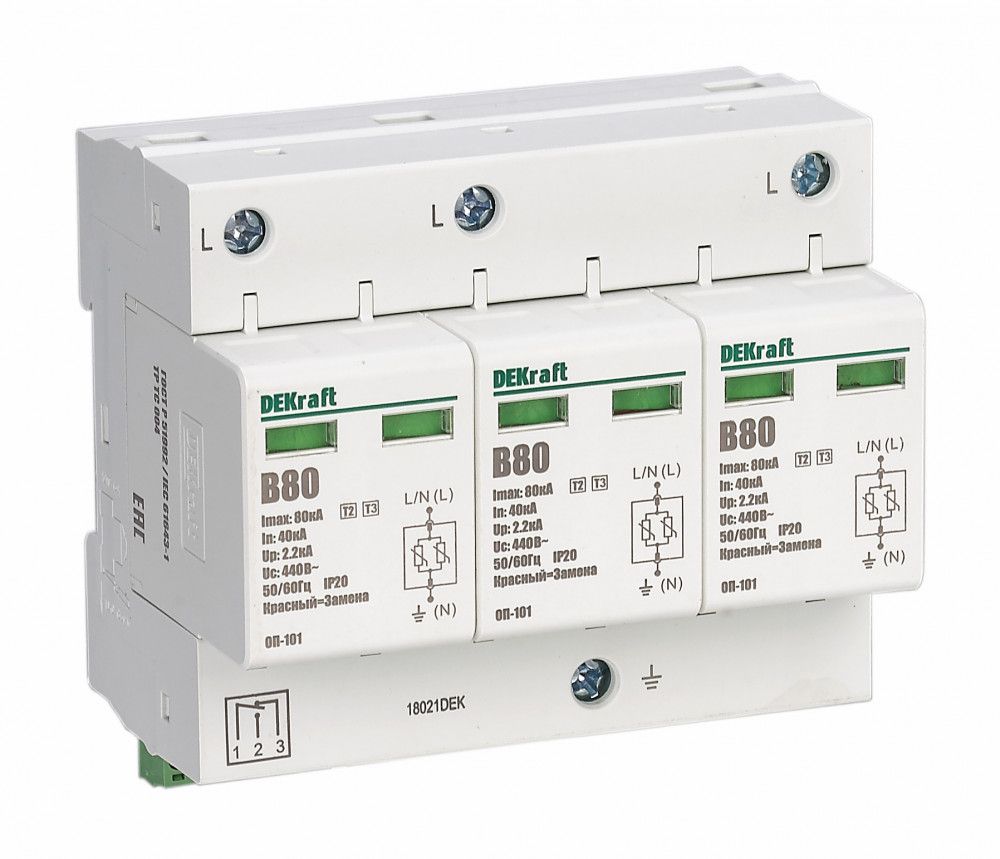 Ограничитель перенапряжения серии ОП-101 Dekraft ; 2P; макс.разрядный ток 80 кА; мак.рабочее напряжение 440 В; класс 1(B); монтаж – на DIN-рейку; ширина – 2 мод. х 18 мм. Ограничители срабатывают за миллиардную долю секунды и надежно защищают оборудование от бросков напряжения. Повышенный уровень защиты позволяет ограничить перенапряжения до 2,2 кВ. Ограничитель оснащён сигнальным контактом. Применяются во ВРУ, ГРЩ, распределительных щитках, коробках и непосредственно возле аппаратов.