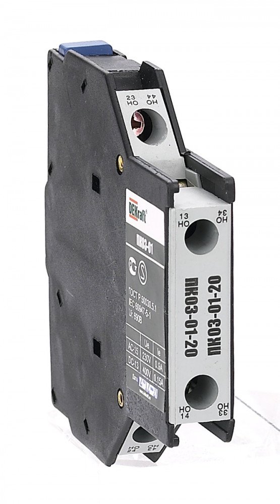 Приставка контактная серии ПК-03-01 для контакторов КМ-103 Dekraft; кол-во контактов - 2НО; ном.ток 10 А; ном.напряжение до 690 В; установка с лицевой стороны; степень защиты IP20. Приставки контактные предназначены для увеличения количества вспомогательных контактов контактора. Приставки боковой установки ПК-03-01 являются эксклюзивом и позволяют значительно сэкономить на глубине шкафа, который будет стоить дешевле.