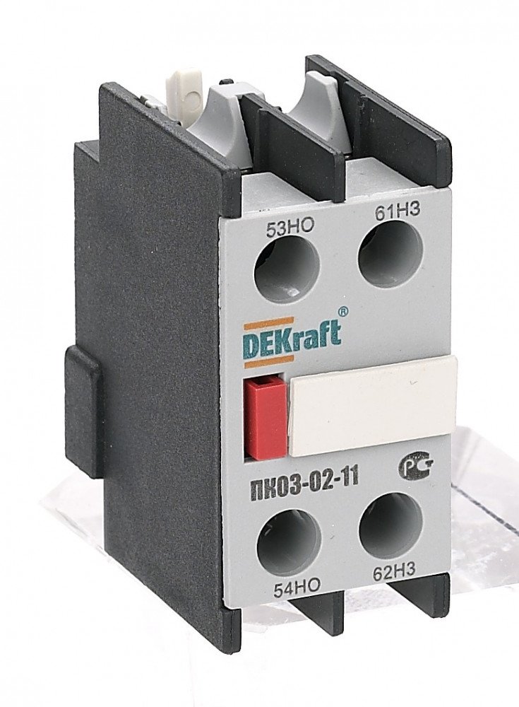 Приставка контактная серии ПК-03-02 для контакторов КМ-103 Dekraft; кол-во контактов - 1НО+1НЗ; ном.ток 10 А; ном.напряжение до 690 В; установка с лицевой стороны; степень защиты IP20. Приставки контактные предназначены для увеличения количества вспомогательных контактов контактора. Контактные приставки механически соединяются с контакторами и фиксируются при помощи защелки. Приставка подходит для использования с контакторами других производителей.