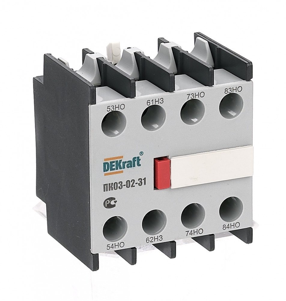 Приставка контактная серии ПК-03-02 для контакторов КМ-103 Dekraft; кол-во контактов - 3НО+1НЗ; ном.ток 10 А; ном.напряжение до 690 В; установка с лицевой стороны; степень защиты IP20. Приставки контактные предназначены для увеличения количества вспомогательных контактов контактора. Контактные приставки механически соединяются с контакторами и фиксируются при помощи защелки. Приставка подходит для использования с контакторами других производителей.
