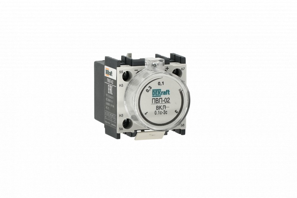 Приставка выдержки времени ПВЛ-02 для контакторов КМ-102 Dekraft; выдержка - 10…180 секунд; задержка - при включении; ном.ток 10 А; ном.напряжение до 690 В; монтаж защелкой на контакторе; степень защиты IP20. Приставки выдержки времени позволяют получить задержку замыкания или размыкания контактов цепи управления, например, в схема включения двигателя «звезда/треугольник; или для обеспечения паузы между циклами технологического процесса.