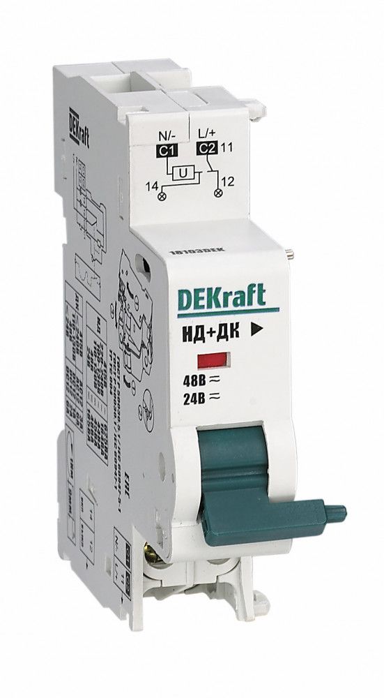Расцепитель независимый серии НД-101 Dekraft для серий ВА-101, ВА-103 NEW, ДИФ-101, ДИФ-101S, ДИФ-102, ДИФ-103 4,5кА NEW; предназначен для дистанционного отключения выключателя; ном.напряжение 22-48 В пер./пост.тока; напряжение срабатывания 70-110% Un; ширина 18 мм; присоединение к аппарату слева.