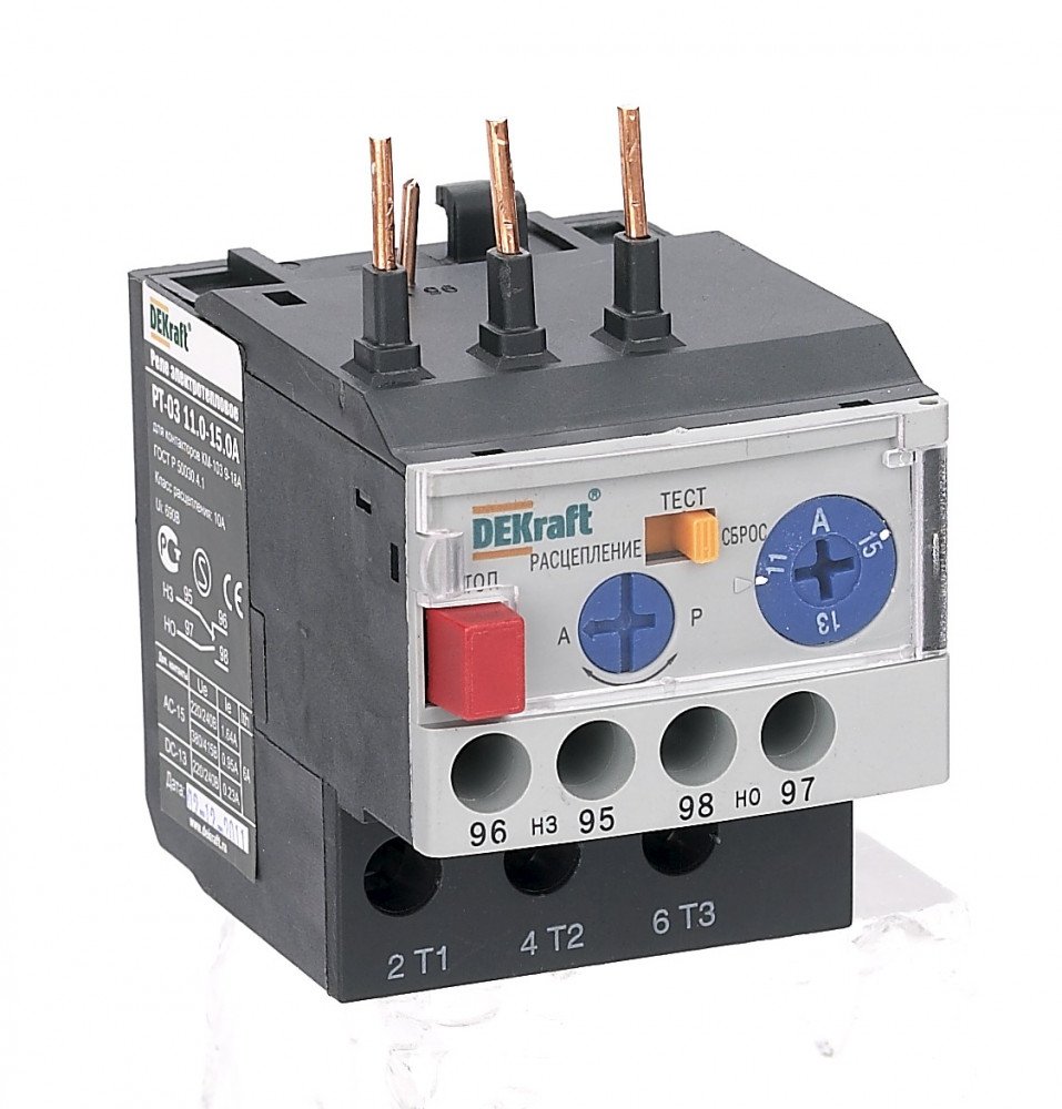 Тепловое реле перегрузки серии РТ-03 Dekraft; предназначено для применения с контакторами КМ-103 на ток 9-18 А; трехполюсное; диапазон уставок реле 14-18 А; класс расцепления 10А; два режима повторного включения - ручной и автоматический. Тепловые реле РТ-03 применяются для защиты цепей переменного тока и электродвигателей от перегрузки, асимметрии фаз, затянутого пуска и заклинивания ротора. Реле подходит к соответствующим контакторам других производителей.