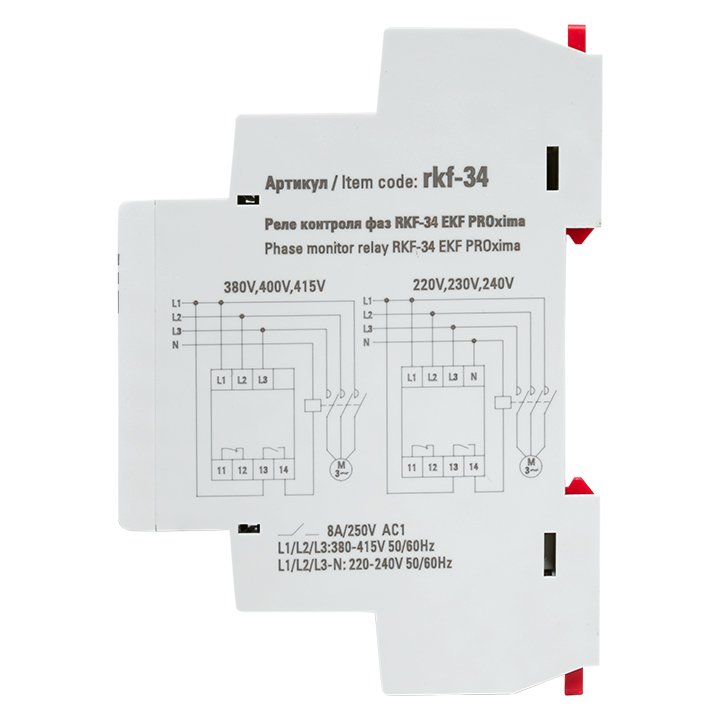 Реле контроля фаз RKF является механическими коммутационным аппаратом, который предназначается для контроля уровня напряжения в трехфазных сетях переменного тока и защитного отключения нагрузки в случае падения или повышения напряжения электрической сети сверх допустимого значения, а также в случае обрыва фазы, неверной последовательности фаз и асимметрии. Данные реле отличаются компактными размерами и универсальностью применения в трех- и четырехпроводных схемах. Реле контролирует следующие параметры: отсутствие фаз, падение напряжения, повышение напряжения, чередование фаз.