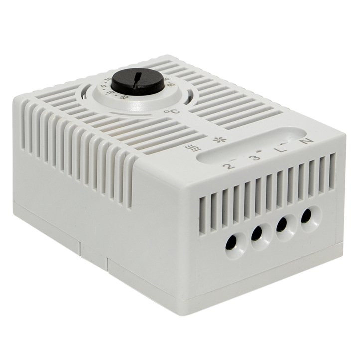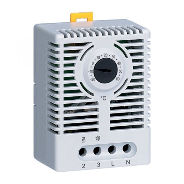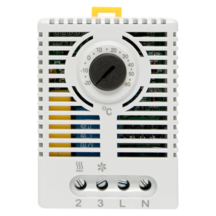 Термостат предназначен для поддержания фиксированной температуры внутри электрощитов. Предназначен для управления исполнительными устройствами: обогревателями и вентиляторами. А так же, для оповещения о превышении предельной температуры. Нормально-замкнутый контакт (NC) используется для регулирования нагревателей.