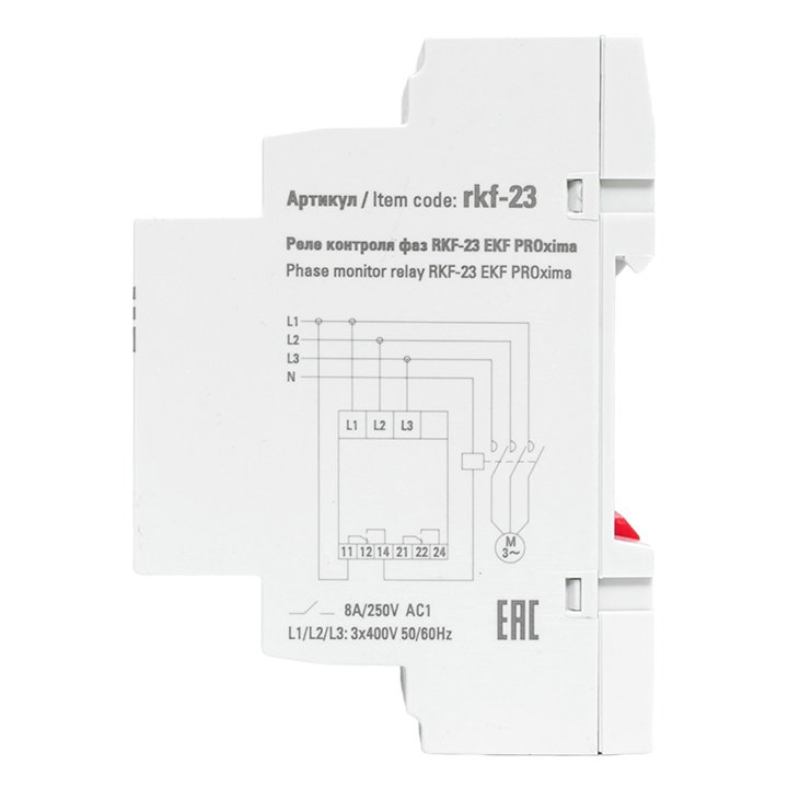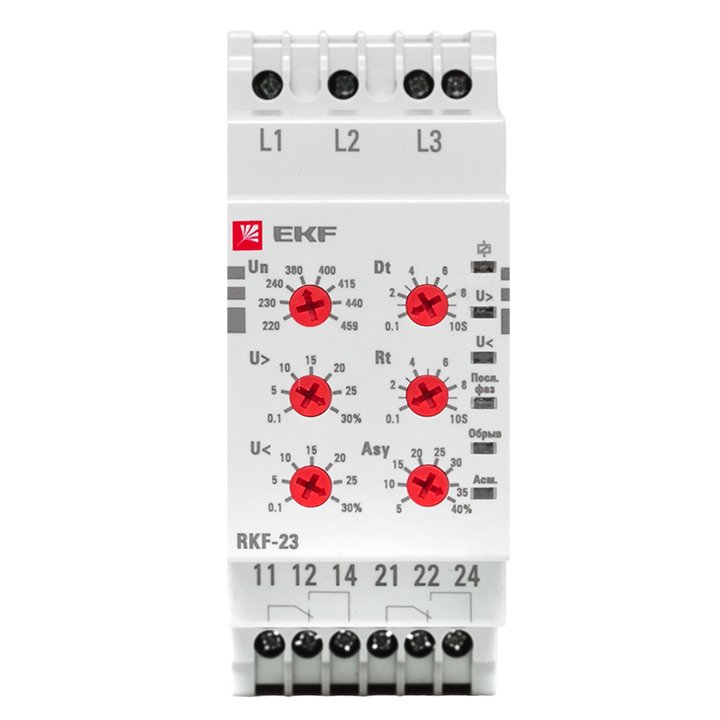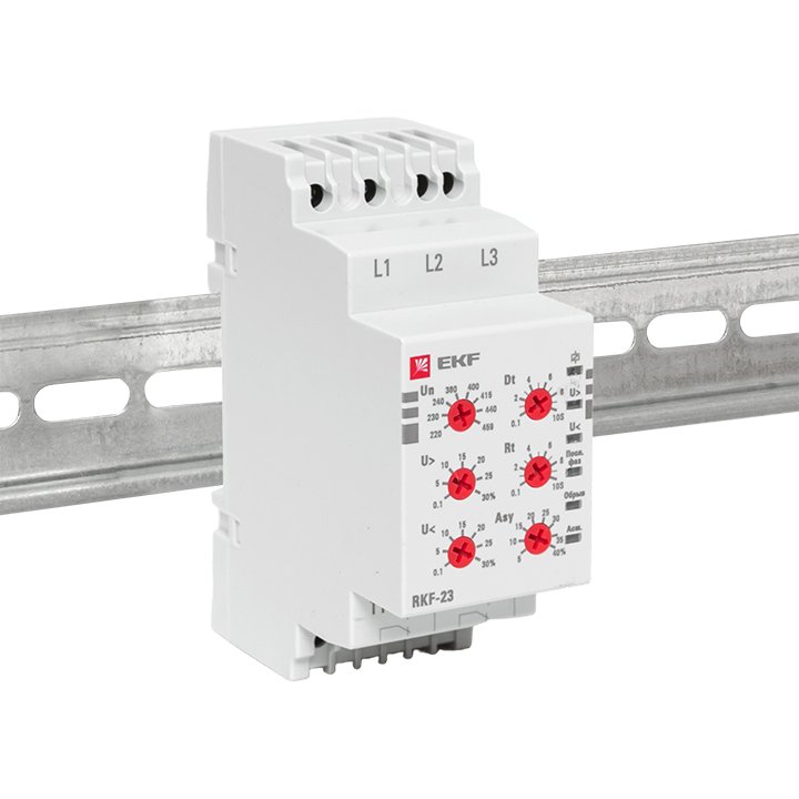 Многофункциональное реле контроля фаз RKF-23 EKF является устройством, созданным на базе микроконтроллера. Реле применяется в системах автоматизации и предназначено для высокоточного контроля качества питания трехфазной сети. 230/400 вольт переменного тока Реле контролирует следующие параметры: