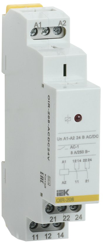 Две контактных группы, с коммутационной возможностью до 8А каждая. Номинальное напряжение катушки реле 24В AC/DC.
