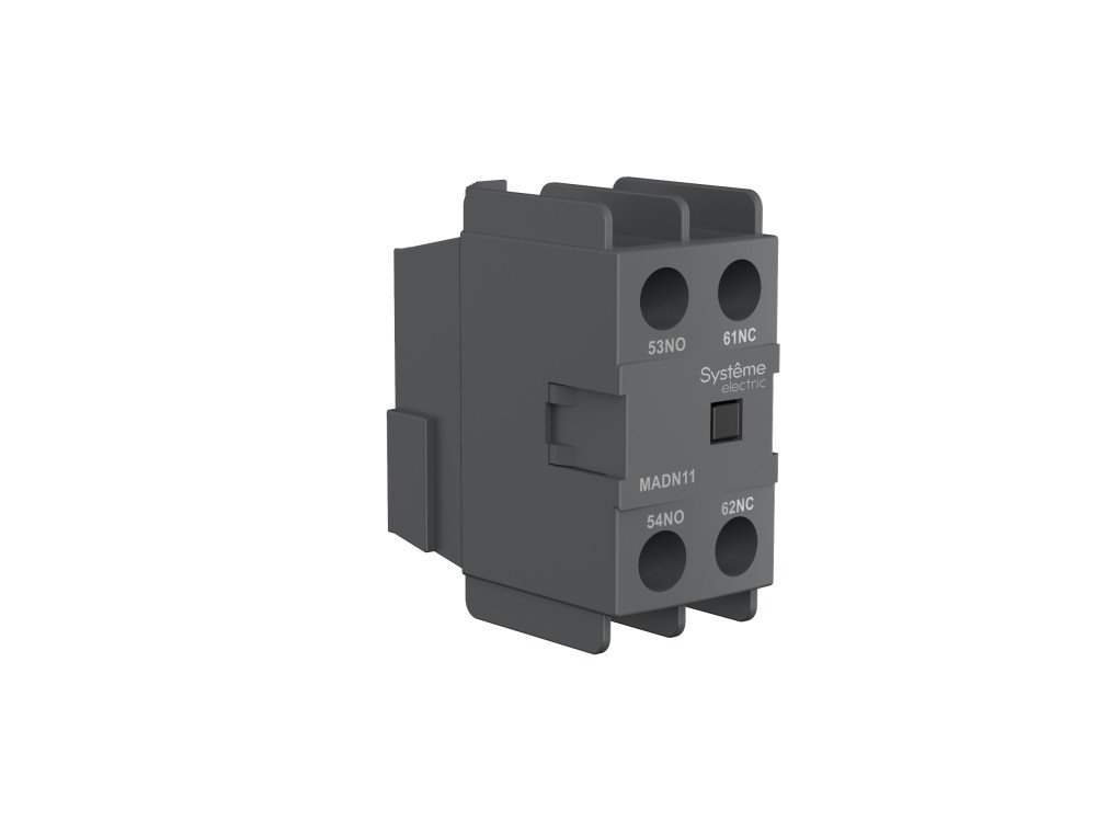 Блок дополнительных контактов для контакторов серии SystemePact MC1D; конфигурация 2НЗ; фронтальный монтаж с помощью винтовых зажимов. Блоки дополнительных контактов применяются совместно с контакторами и предназначены для увеличения количества вспомогательных контактов, использующихся в цепях сигнализации и управления.