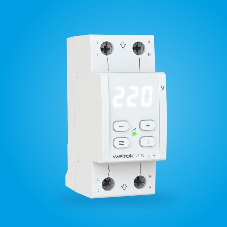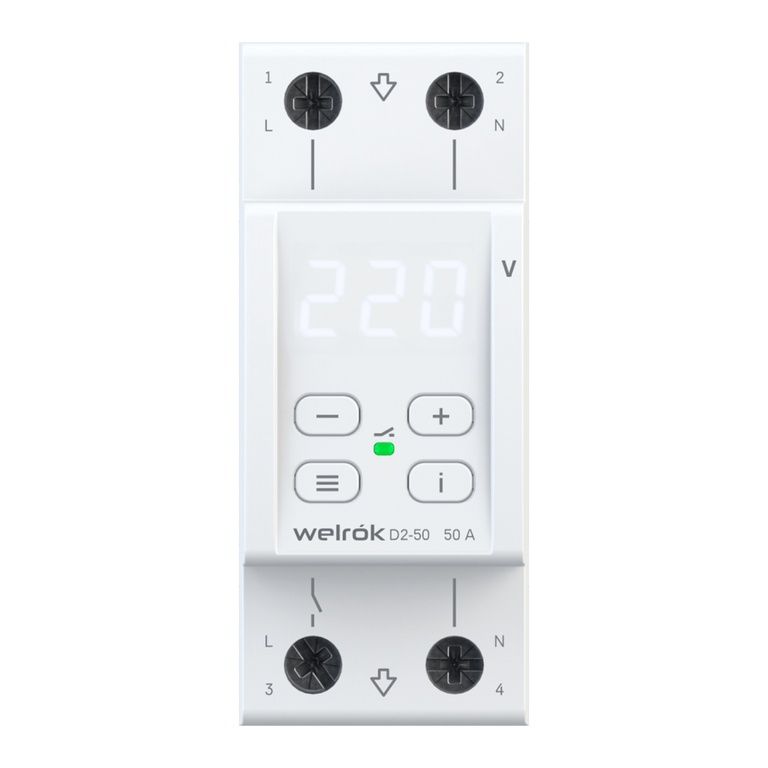 Однофазное реле напряжения Welrok D2-50 в компактном корпусе Компактное реле напряжения WELROK D2-50 занимает всего 2 модуля в щитке. Реле напряжения Welrok D2-50 защищает оборудование от скачков и провалов напряжения, обрыва нулевого провода. Реле отключает нагрузку, если сетевое напряжение выходит за установленные пределы. Когда значение напряжения вернется в норму, нагрузка будет автоматически включена обратно. Гарантия 10 лет На все реле напряжения Welrok действует 10-летняя гарантия от производителя. Максимальная функциональность Welrok D2-50 — компактное реле на 2 модуля с мощным функционалом: Скорость срабатывания реле < 0,03 сек. TrueRMS для точного измерения напряжения Для уменьшения количества срабатываний: Защита от частых срабатываний Регулируемый гистерезис Регулируемая задержка включения нагрузки Профессиональная модель отключения при выходе напряжения за пределы Для анализа питающей сети по характеру аварийных срабатываний: Журнал срабатываний на 100 значений Для комфортной и безопасн