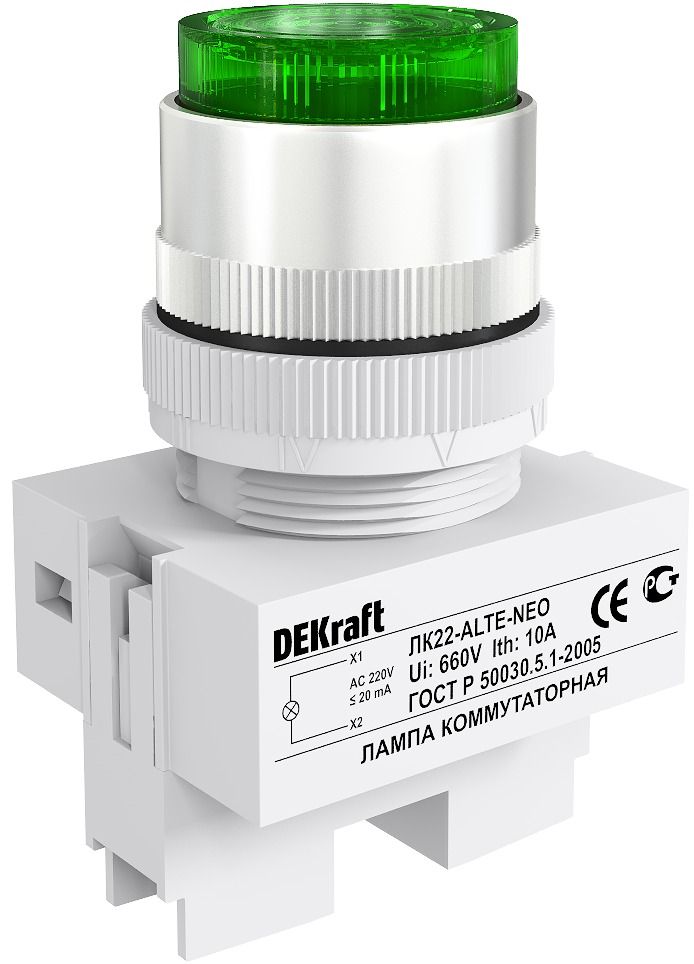 Лампа сигнальная ADDS серии ЛК-22 Dekraft; светодиодная; зеленая неоновая; круглая; номинальное напряжение 220 В пер.тока; установка - на панели или двери; степень защиты - IP54. Лампы сигнальные предназначены для индикации состояния электрических цепей и коммутационных аппаратов. Использование в лампах светодиодных матриц (LED) снижает потребление электроэнергии. Низкая чувствительность к колебаниям напряжения позволяет использовать их в электрических цепях с нестабильным напряжением.