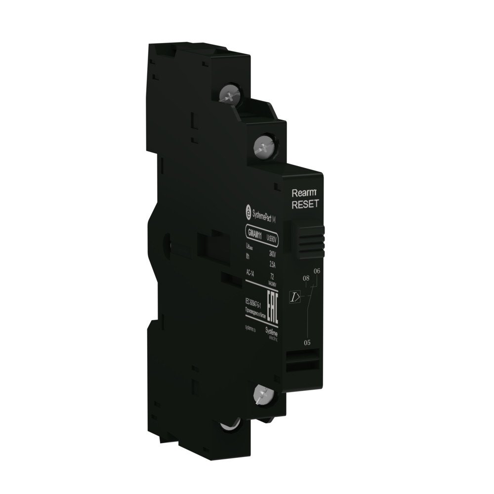 Дополнительный контакт сигнализации короткого замыкания для автоматических выключателей серии SystemePact GM2, исполнение – 1CO (перекидной контакт), монтаж – сбоку слева от выключателя. Дополнительный контакт применяется совместно с автоматическими выключателями и предназначен сигнализации отключения из-за короткого замыкания.