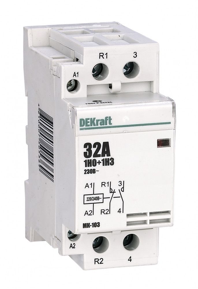 Модульный контактор серии МК-103 Dekraft; ном.ток 40 А (АС-7а); кол-во и исполнение контактов – 1НО+1НЗ; напряжение управления 220 В пер.тока; ширина – 2 мод. х 18 мм; установка – на DIN-рейку. Контакторы МК-103 применяются в сетях напряжением до 400 В пер.тока для дистанционного управления небольшими нагрузками, требующими большого количества включений / отключений, например, насосы, системы вентиляции и т.п. Модульные контакторы не требуют дополнительных настроек и специального обслуживания.