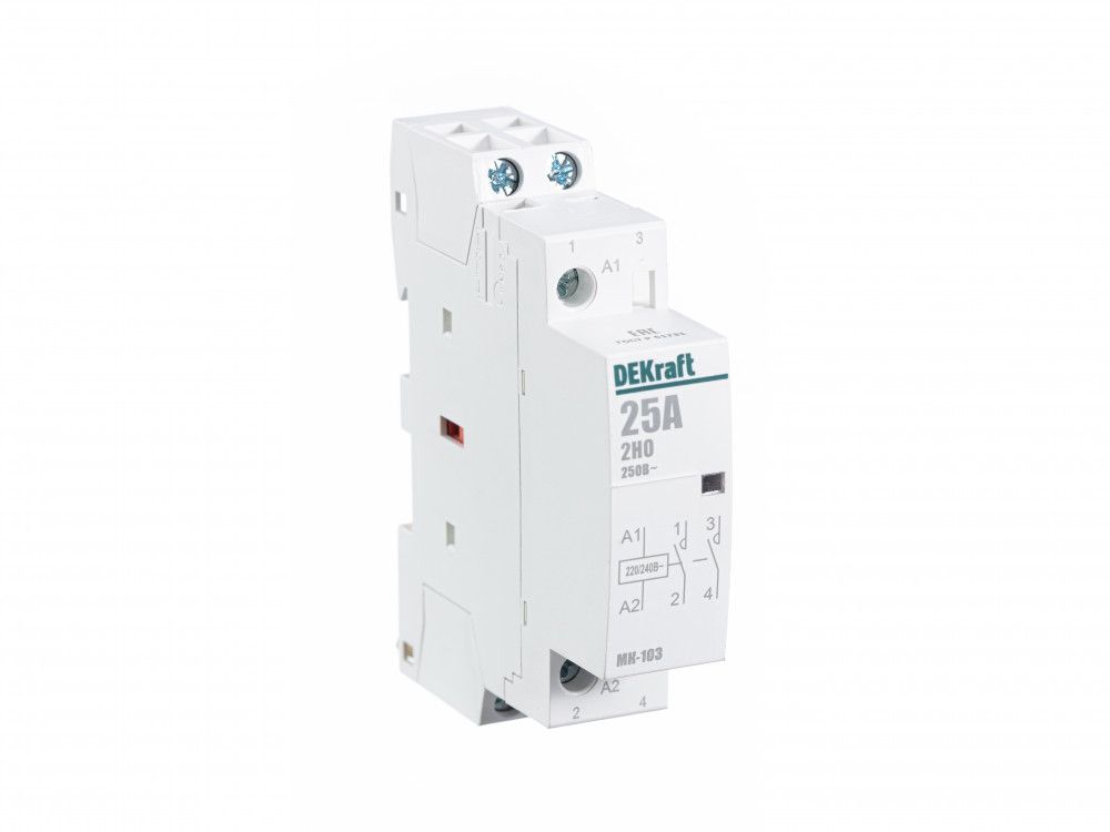 Модульный контактор серии МК-103 Dekraft; ном.ток 25 А (АС-7а); кол-во и исполнение контактов – 2НО; напряжение управления 220 В пер.тока; ширина – 1 мод. х 18 мм; установка – на DIN-рейку. Контакторы МК-103 применяются в сетях напряжением до 400 В пер.тока для дистанционного управления небольшими нагрузками, требующими большого количества включений / отключений, например, насосы, системы вентиляции и т.п. Модульные контакторы не требуют дополнительных настроек и специального обслуживания.
