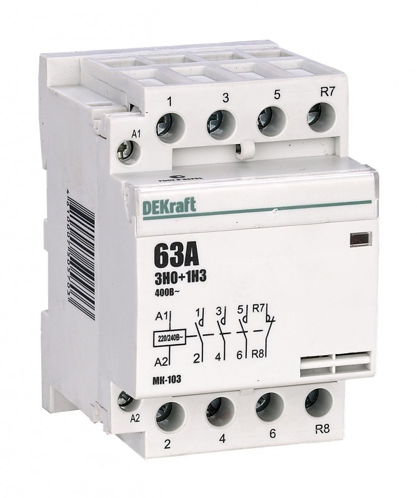 Модульный контактор серии МК-103 Dekraft; ном.ток 32 А (АС-7а); кол-во и исполнение контактов – 3НО+1НЗ; напряжение управления 220 В пер.тока; ширина – 3 мод. х 18 мм; установка – на DIN-рейку. Контакторы МК-103 применяются в сетях напряжением до 400 В пер.тока для дистанционного управления небольшими нагрузками, требующими большого количества включений / отключений, например, насосы, системы вентиляции и т.п. Модульные контакторы не требуют дополнительных настроек и специального обслуживания.