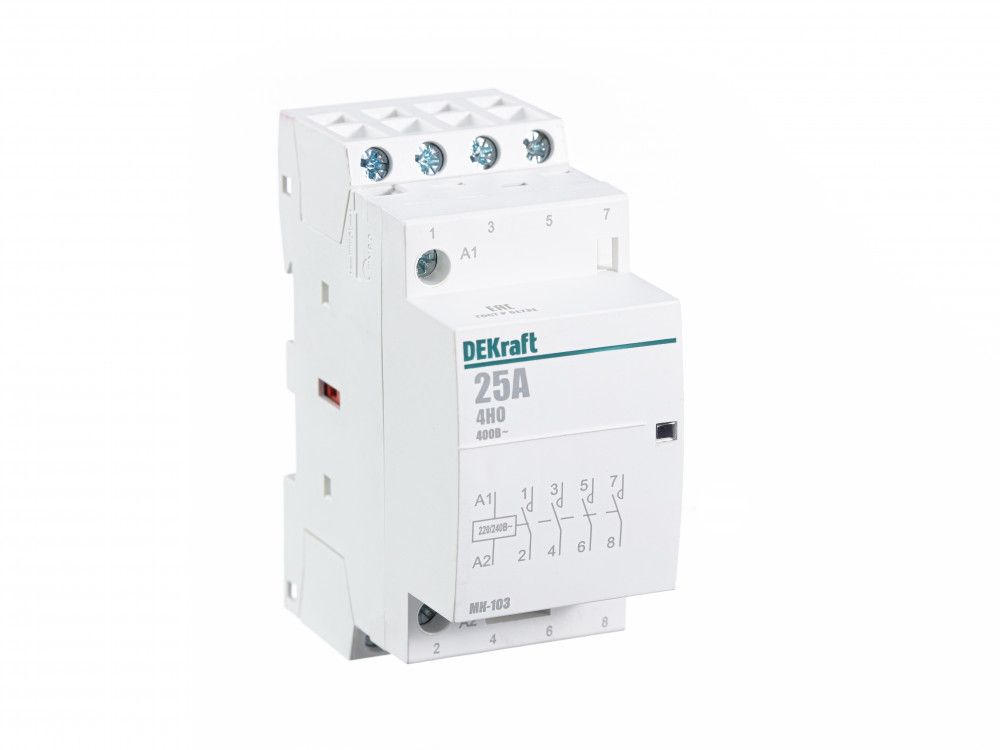 Модульный контактор серии МК-103 Dekraft; ном.ток 25 А (АС-7а); кол-во и исполнение контактов – 4НО; напряжение управления 220 В пер.тока; ширина – 2 мод. х 18 мм; установка – на DIN-рейку. Контакторы МК-103 применяются в сетях напряжением до 400 В пер.тока для дистанционного управления небольшими нагрузками, требующими большого количества включений / отключений, например, насосы, системы вентиляции и т.п. Модульные контакторы не требуют дополнительных настроек и специального обслуживания.