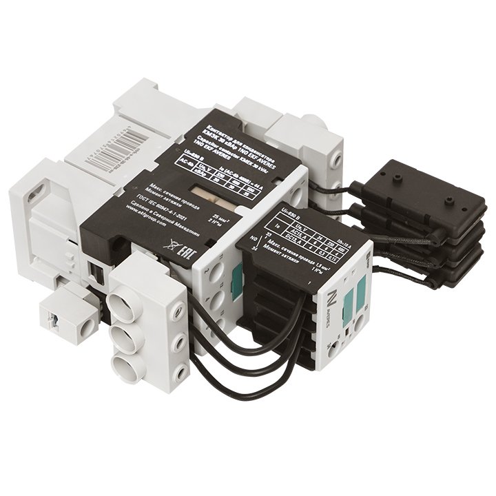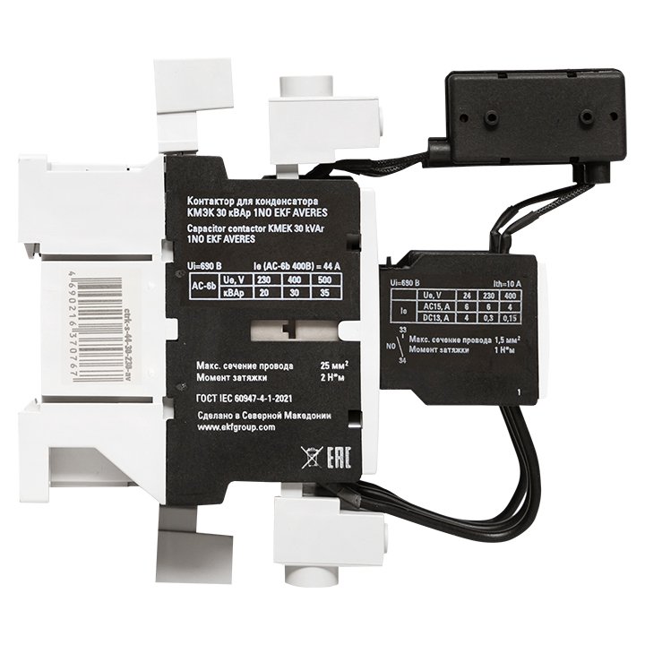 Контактор для конденсатора КМЭК AVERES - это специализированный контактор двухступенчатого включения для коммутации конденсаторов в установках компенсации реактивной мощности (УКРМ). Контакторы КМЭК EKF AVERES состоят из корпуса, закрепленных в нем двух рядов неподвижных контактов, подвижных контактов, которые закреплены в подвижной части магнитной системы. На первом ряду контактов с коммутированы зарядные резисторы. Неподвижная часть магнитной системы закреплена жестко в корпусе КМЭК. Пружина препятствует смыканию контактов. При подаче напряжения на катушку управления в магнитной системе контактора возникает магнитное поле, которое, преодолевая сопротивление пружины, смыкает магнитную систему и замыкает сначала верхнюю группу контактов и через 0,1-0,2 секунды вторую, силовую группу контактов. При этом пусковой ток конденсаторов гаситься на резисторах. При отключении напряжения с катушки управления пружина размыкает контакты. Возможна коммутация алюминиевым и медным проводом.