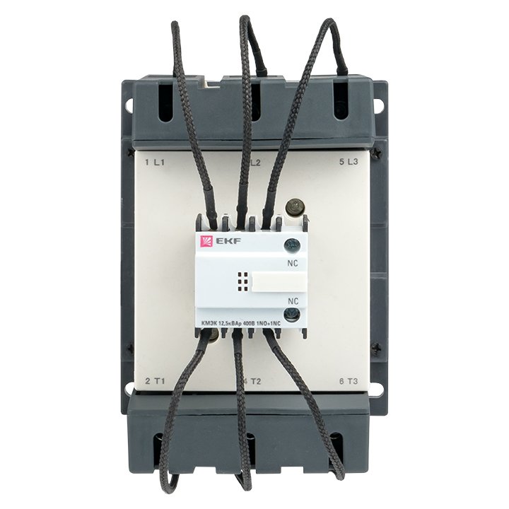 Контактор для конденсатора КМЭК PROxima это специализированный контактор двухступенчатого включения для коммутации конденсаторов в установках компенсации реактивной мощности (УКРМ). Контакторы КМЭК EKF PROxima состоят из корпуса, закрепленных в нем двух рядов неподвижных контактов, подвижных контактов, которые закреплены в подвижной части магнитной системы. На первом ряду контактов с коммутированы зарядные резисторы. Неподвижная часть магнитной системы закреплена жестко в корпусе КМЭК. Пружина препятствует смыканию контактов. При подаче напряжения на катушку управления в магнитной системе контактора возникает магнитное поле, которое, преодолевая сопротивление пружины, смыкает магнитную систему и замыкает сначала верхнюю группу контактов и через 0,1-0,2 секунды вторую, силовую группу контактов. При этом пусковой ток конденсаторов гаситься на резисторах. При отключении напряжения с катушки управления пружина размыкает контакты. Возможна коммутация алюминиевым и медным проводом.