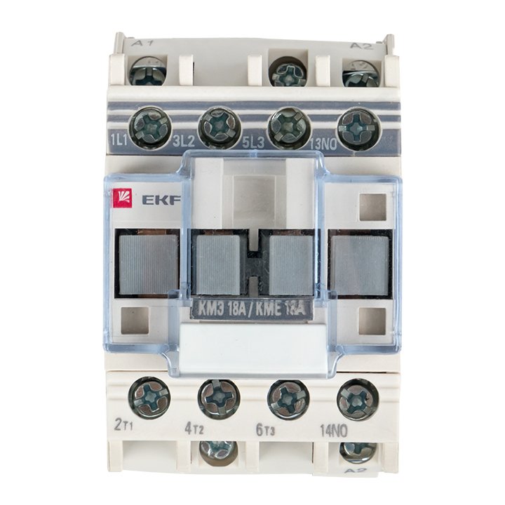 Контакторы КМЭ EKF PROxima состоят из корпуса, закрепленных в нем неподвижных контактов, подвижных контактов, которые закреплены в подвижной части магнитной системы. Неподвижная часть магнитной системы закреплена жестко в корпусе КМЭ. Пружина препятствует смыканию контактов. При подаче напряжения на катушку управления в магнитной системе контактора возникает магнитное поле, которое, преодолевая сопротивление пружины, смыкает магнитную систему и замыкает контакты. При отключении напряжения с катушки управления пружина размыкает контакты. Возможна коммутация алюминиевыми медным проводом.