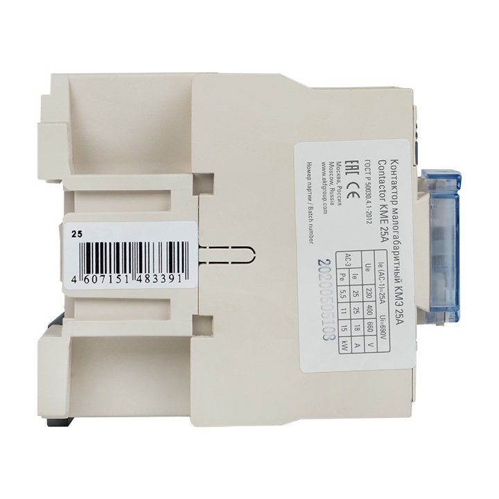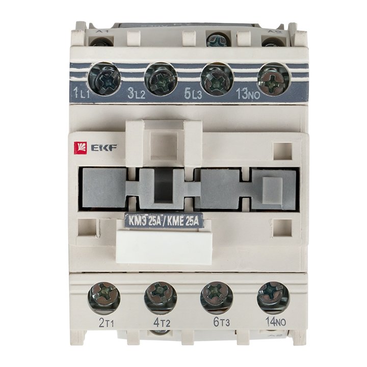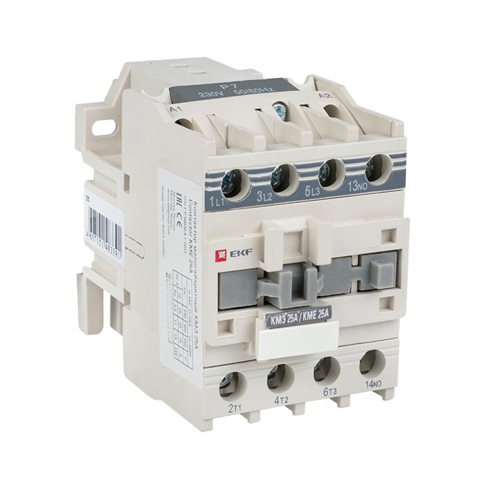 Контакторы КМЭ EKF PROxima состоят из корпуса, закрепленных в нем неподвижных контактов, подвижных контактов, которые закреплены в подвижной части магнитной системы. Неподвижная часть магнитной системы закреплена жестко в корпусе КМЭ. Пружина препятствует смыканию контактов. При подаче напряжения на катушку управления в магнитной системе контактора возникает магнитное поле, которое, преодолевая сопротивление пружины, смыкает магнитную систему и замыкает контакты. При отключении напряжения с катушки управления пружина размыкает контакты. Возможна коммутация алюминиевыми медным проводом.