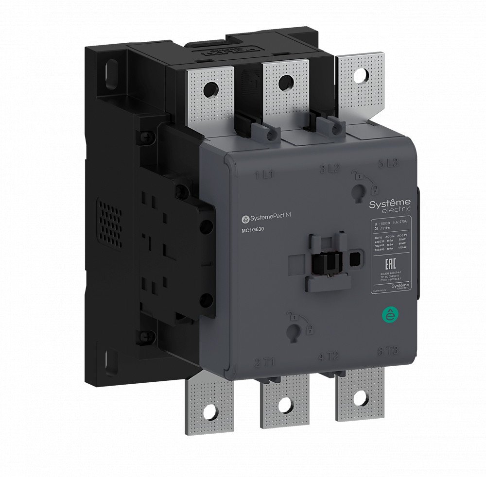 Контактор серии SystemePact MC1G на номинальный ток 500 А, 3P, 2НО+2НЗ; напряжение управления – 48…130 В пер./пост. тока; защита от просадок напряжения от 0,7 до 1,2 Us; крепеж – на монтажной плате. Контакторы серии SystemePact MC1G разработаны для управления двигателями различных типов, а также насосами, лифтов и системами вентиляции. Они имеют увеличенный электрический и механический ресурс; могут оснащаться дополнительными контактами, тепловыми реле, механическими блокировками.