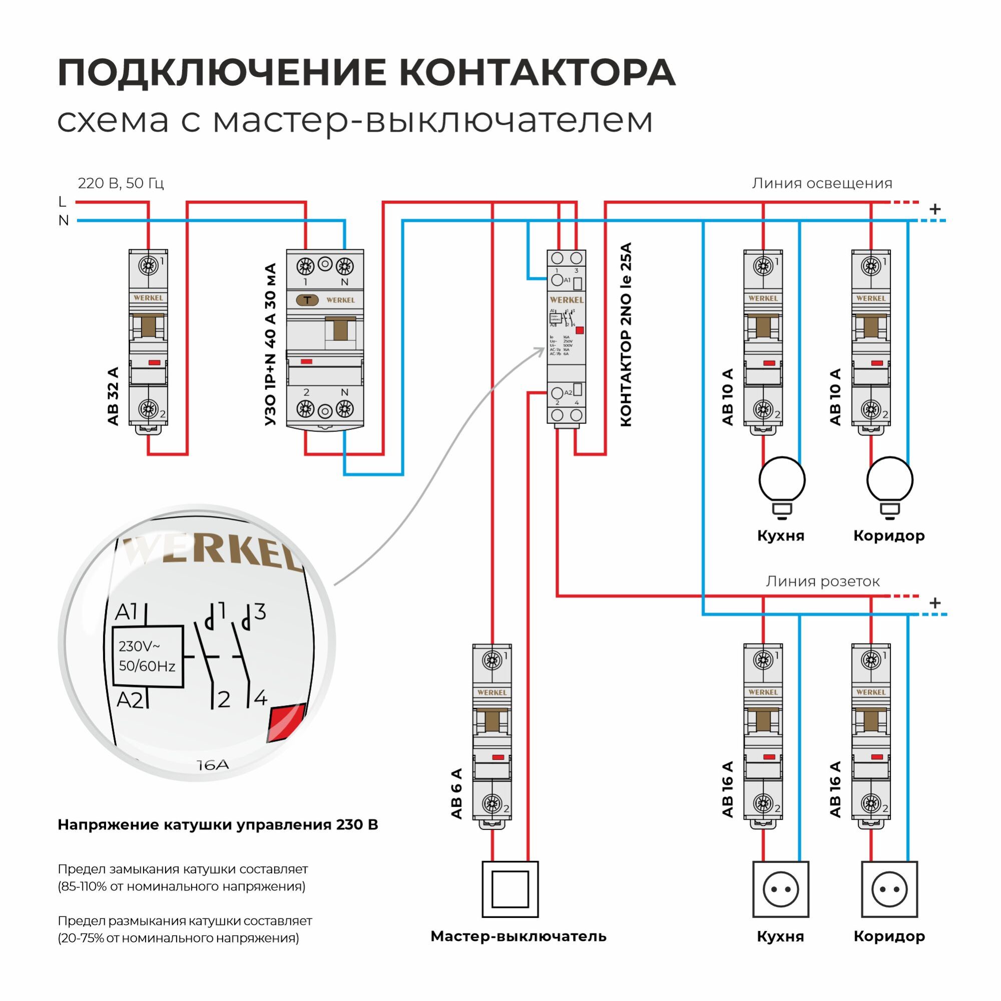 <p> Контактор – это электромагнитное реле, предназначенное для замыкания и размыкания силовых электрических цепей. Он используется для управления мощными электрическими приборами в системах отопления, вентиляции, водоснабжения, полива, освещения придомовых территорий и дорог. Контакторы незаменимы в схемах освещения с мастер-выключателем. При подаче напряжения 220 В / 50 Гц на управляющие контакты A1 и А2 происходит одновременное замыкание контактных пар силовой цепи. <br> Контактор отличается долговечностью и устойчивостью к частым включениям-выключениям благодаря использованию контактов из меди с серебряным напылением и надежной дугогасительной камере. </p> <p> <strong>Модульные устройства Werkel сертифицированы в соответствии с требованиями EAC.</strong> </p> <p> Все контакторы Werkel оснащены окошком для маркировки и индикатором состояния контактов управляемой цепи. На лицевой стороне нанесены характеристики, схема подключения, позволяющая ускорить монтаж. <br> Линейка включает в себя 7 моделей с нормально открытыми (NO) контактами. Контакторы представлены в двух и четырехполюсном исполнении и рассчитаны на номинальный ток 16, 20, 25, 40 и 63 А. </p>