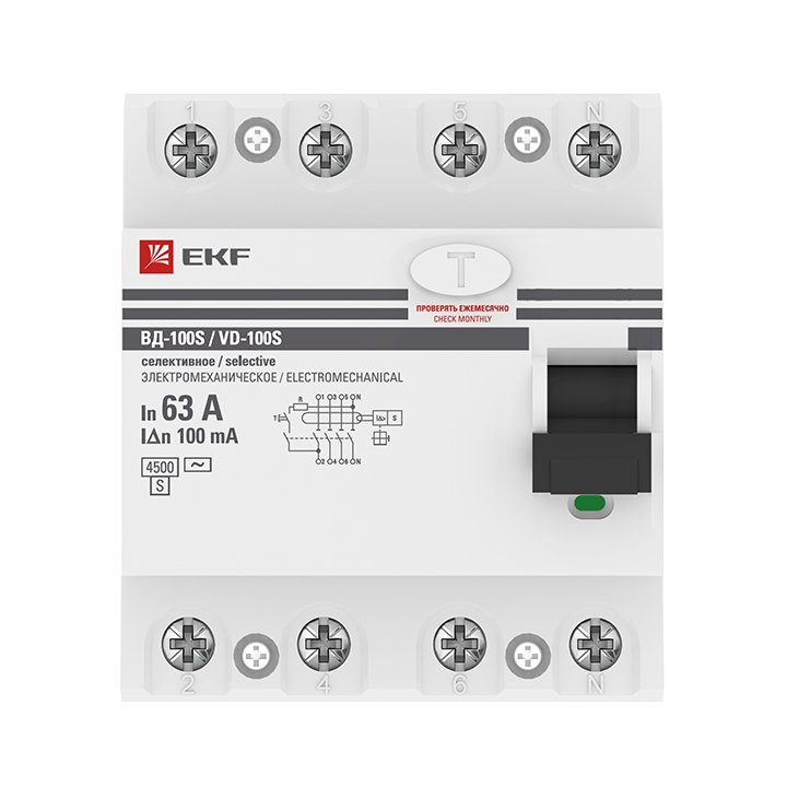 EKF PROxima ВД-100 УЗО 4P 63А/100мА (S) электромеханическое, арт elcb-4-63-100S-em-pro