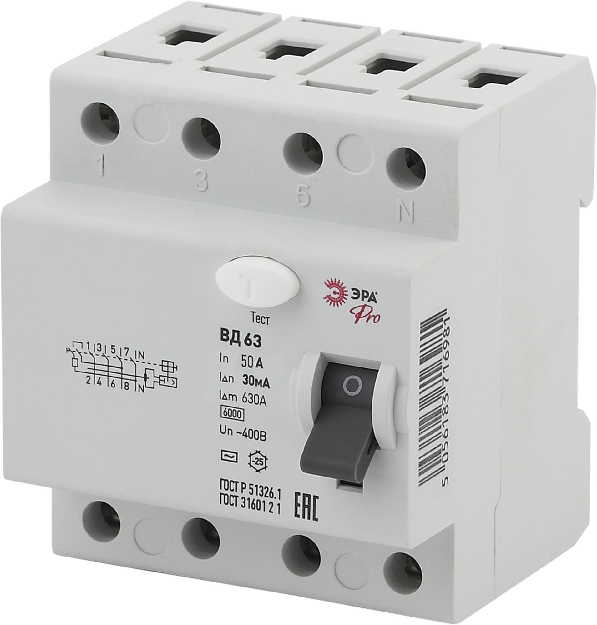 —ЭРА NO-902-134 Устройство защитного отключения УЗО ВД63 4Р 50А 30мА, арт Б0031955