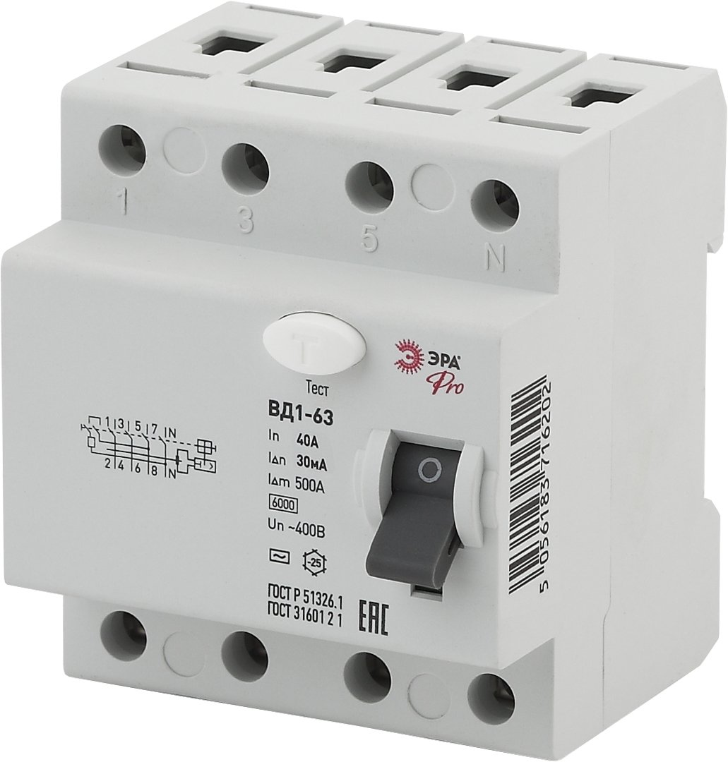 —ЭРА NO-902-39 Pro Устройство защитного отключения УЗО ВД1-63 3P+N 40А 30мА, арт Б0031884