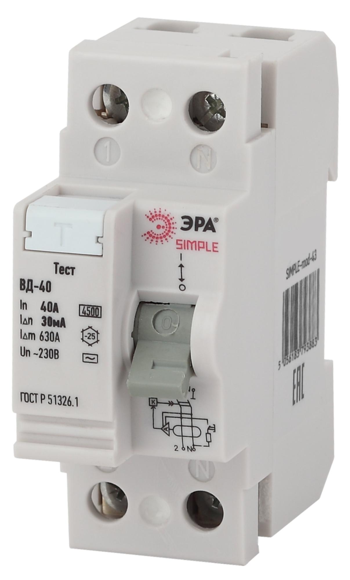 —ЭРА SIMPLE-mod-43 SIMPLE Устройство защитного отключения УЗО ВД-40 2P 40А/30мА (электронное), арт Б0039263
