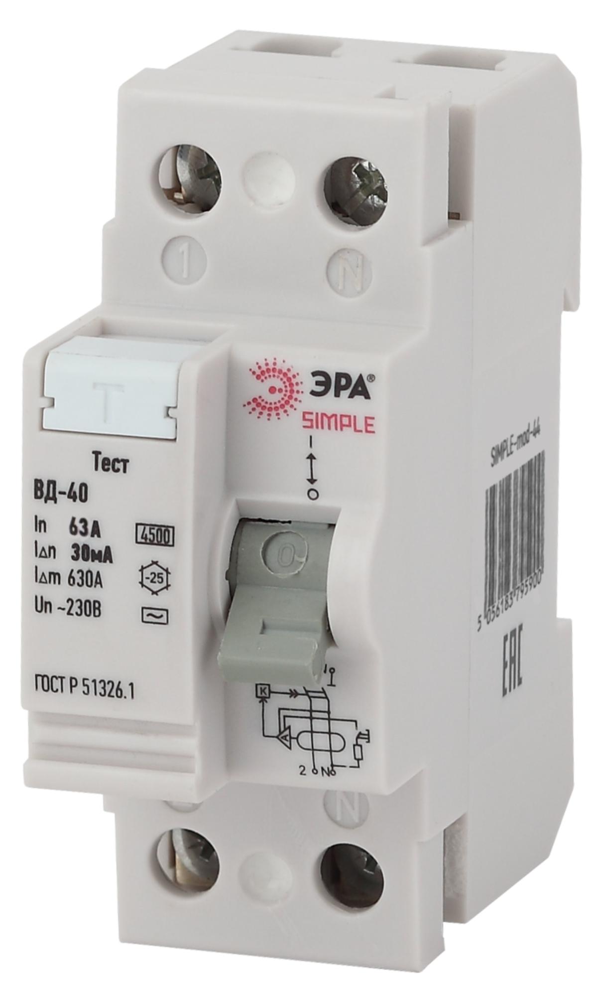 —ЭРА SIMPLE-mod-44 SIMPLE Устройство защитного отключения УЗО ВД-40 2P 63А/30мА (электронное), арт Б0039264