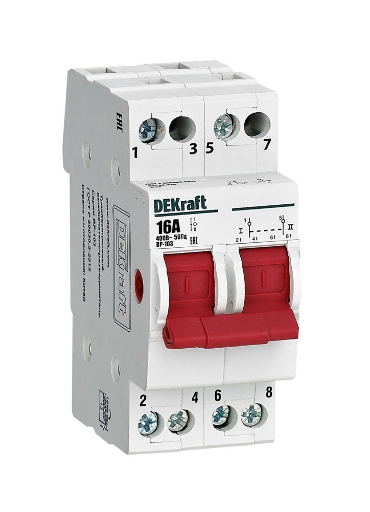 Выключатель-разъединитель трехпозиционный серии ВР-103 Dekraft, 2-полюсный; номинальный ток 16 А, установка – на 35мм DIN-рейку, установочное положение - любое, с красной рукояткой управления. Категория применения AC-22B.