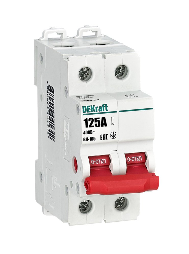 Выключатель-разъединитель серии ВН-105 Dekraft, 2-полюсный; номинальный ток 125 А, установка – на 35мм DIN-рейку, установочное положение - любое, с красной рукояткой управления. Высокие характеристики механической и электрической износостойкости. Категория применения AC-22A. Применяется для ручного включения/отключения сетей напряжением 230 В AC. Специальные мостиковые контакты обеспечивают надежный разрыв цепи; они полностью исключают возможность перекрытия дугой по изоляции.